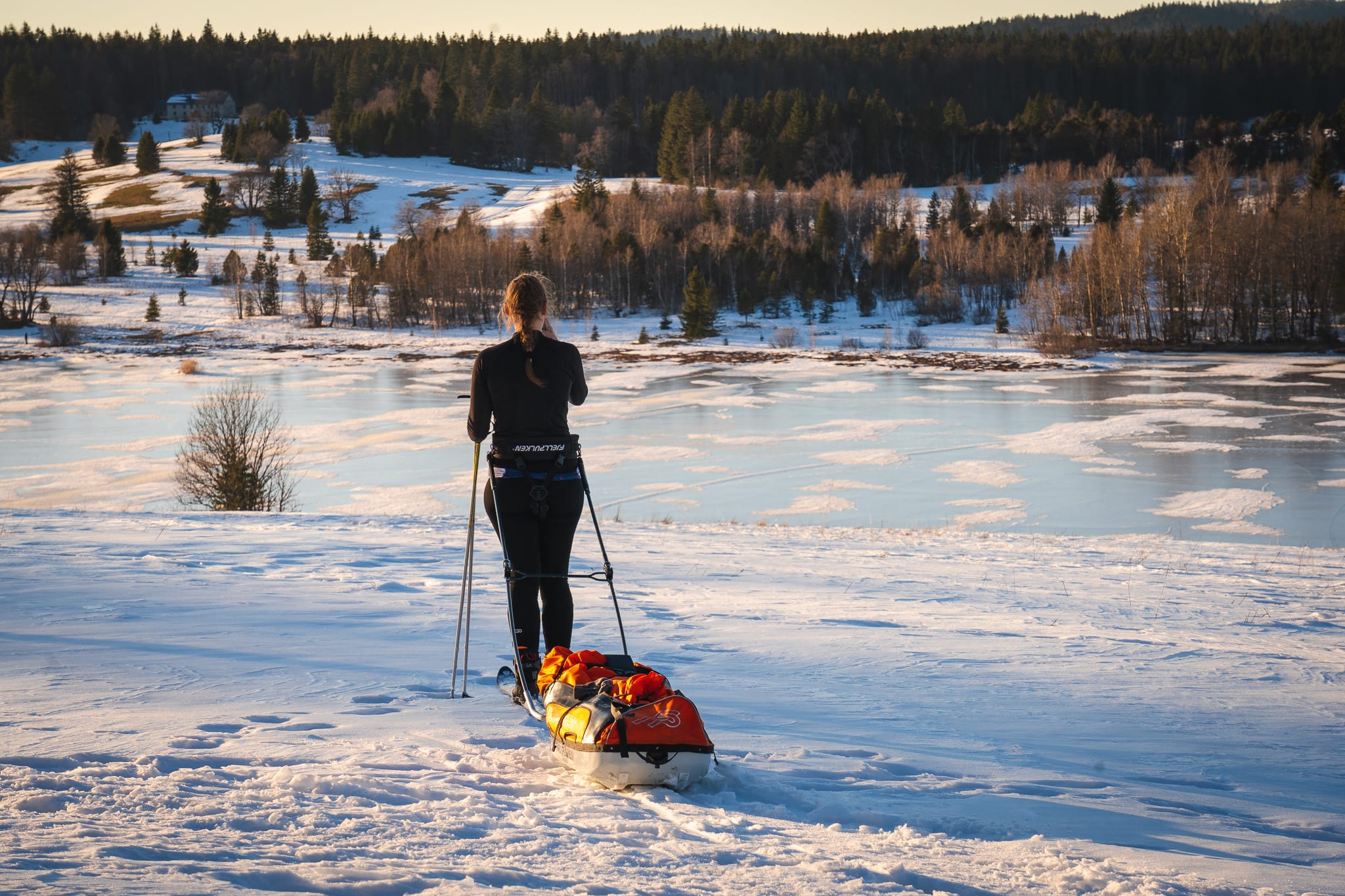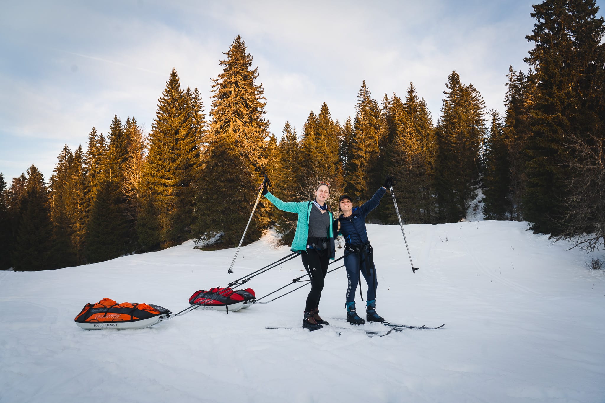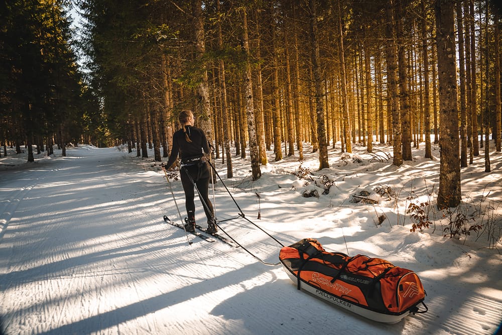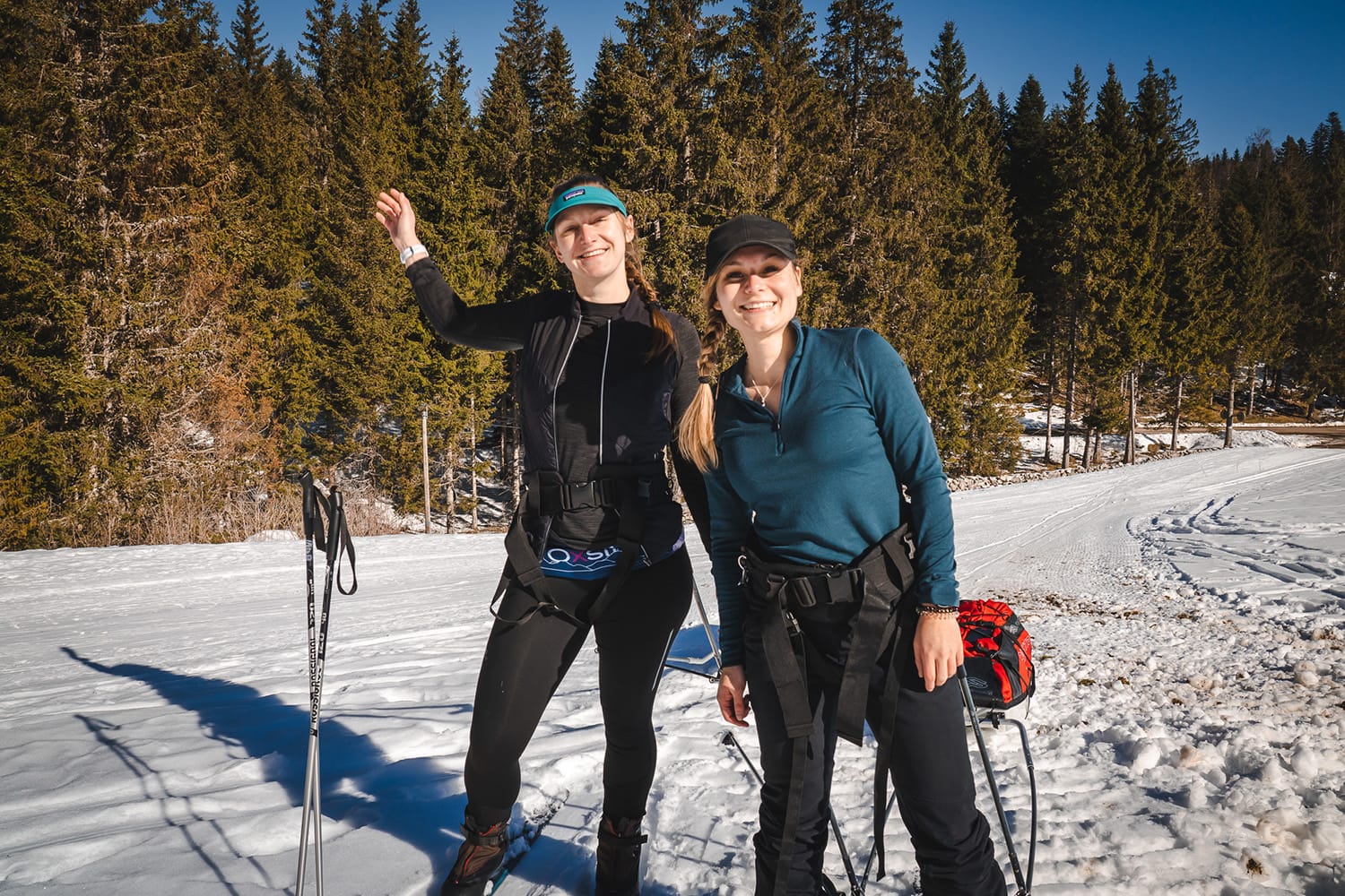 Après avoir chargé méticuleusement les pulkas pendant 30 minutes, nous rejoignons la piste de ski de fond pour le départ à 12h. N’ayant jamais skié avec des pulkas nous ne sommes pas certaines de les avoir bien accrochées, mais c’est pas grave, on est là pour apprendre (spoiler : on les avait mal attachées 😂), c’est un peu le but de cette semaine en autonomie.