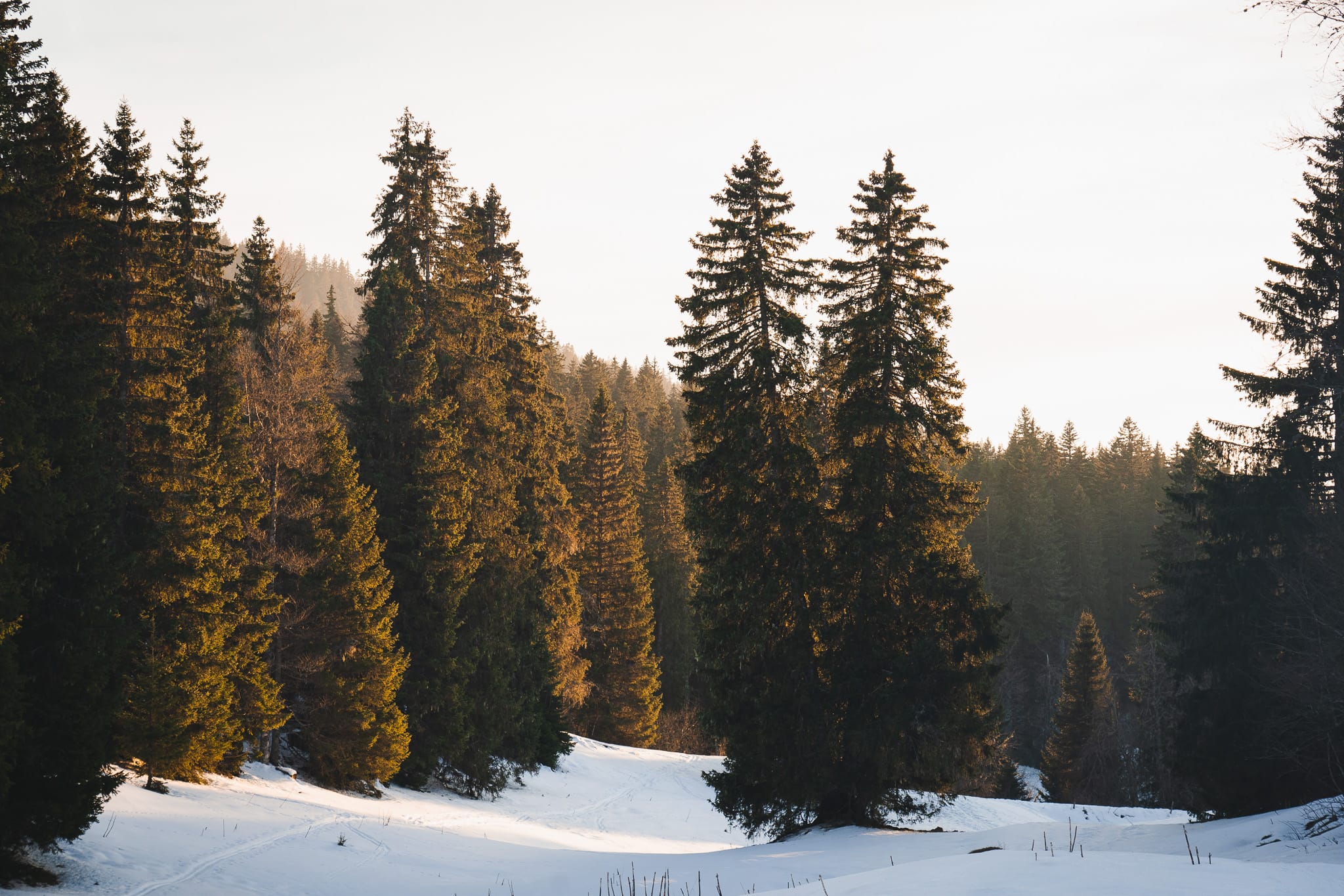 Un dernier coup de cul sur une piste de fond totalement glacée pour bien nous réveiller et nous mettre en jambes, le reste de l’étape sera essentiellement de la descente à travers la forêt du massacre. Le soleil se lève pendant les premiers kilomètres et vient nous réchauffer doucement à travers les épicéas.