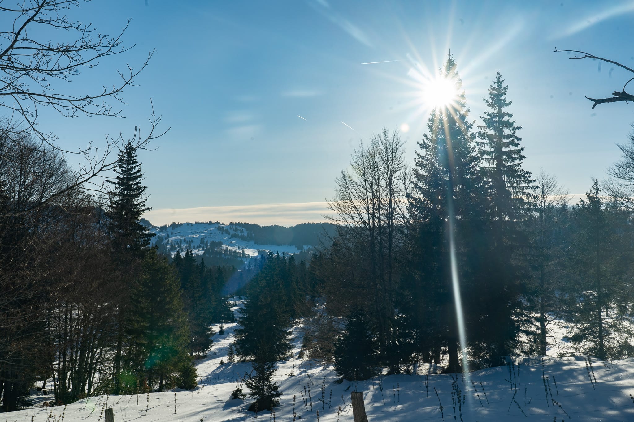 Au bout de 5 km, en faisant une petite pause crème solaire, on croit entendre un tétras lyre ! Un peu tôt pour la saison mais pas étonnant avec le manque de neige… On ne saura jamais si c’était bien un tétras, mais nous profitons des paysages magnifiques qui nous entourent. Les forêts jurassiennes sont définitivement mes préférées…