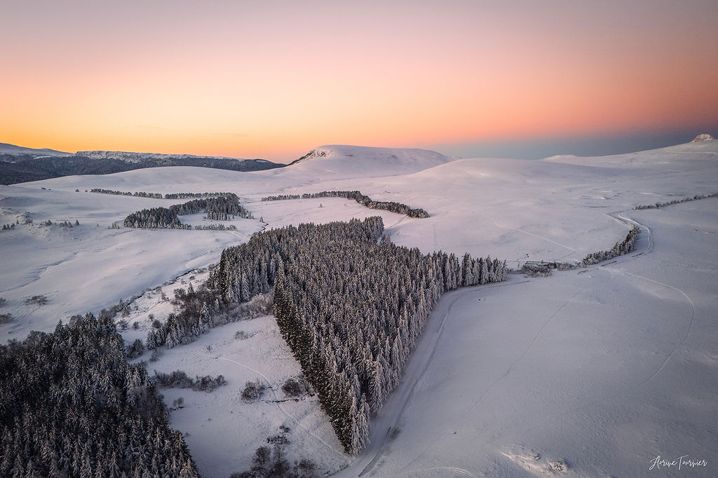 L’Auvergne sous la neige… j’adore. Et encore plus sur le plateau du Guéry, l’un de mes endroits préférés ici. Un léger saupoudrage, un ciel parfaitement dégagé et un froid sec de –10 °C : tout était réuni pour offrir ce splendide lever de soleil hivernal sur le Guéry.