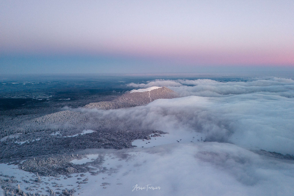 La veille, les prévisions étaient formelles : chutes de neige et mer de nuages au petit matin. Réveillée de bonne heure, j’attaque la montée du Puy de Dôme. L’ambiance est irréelle, presque magique. Je sors le drone et capture le Puy Pariou, saupoudré de neige et entouré d’une mer de nuages. Je n’aurais pas pu rêver mieux. J’espère que ce cadre du Puy Pariou sous la neige trouvera sa place chez vous.